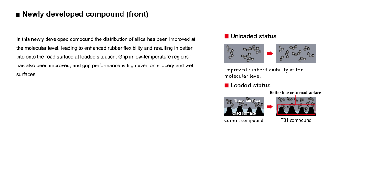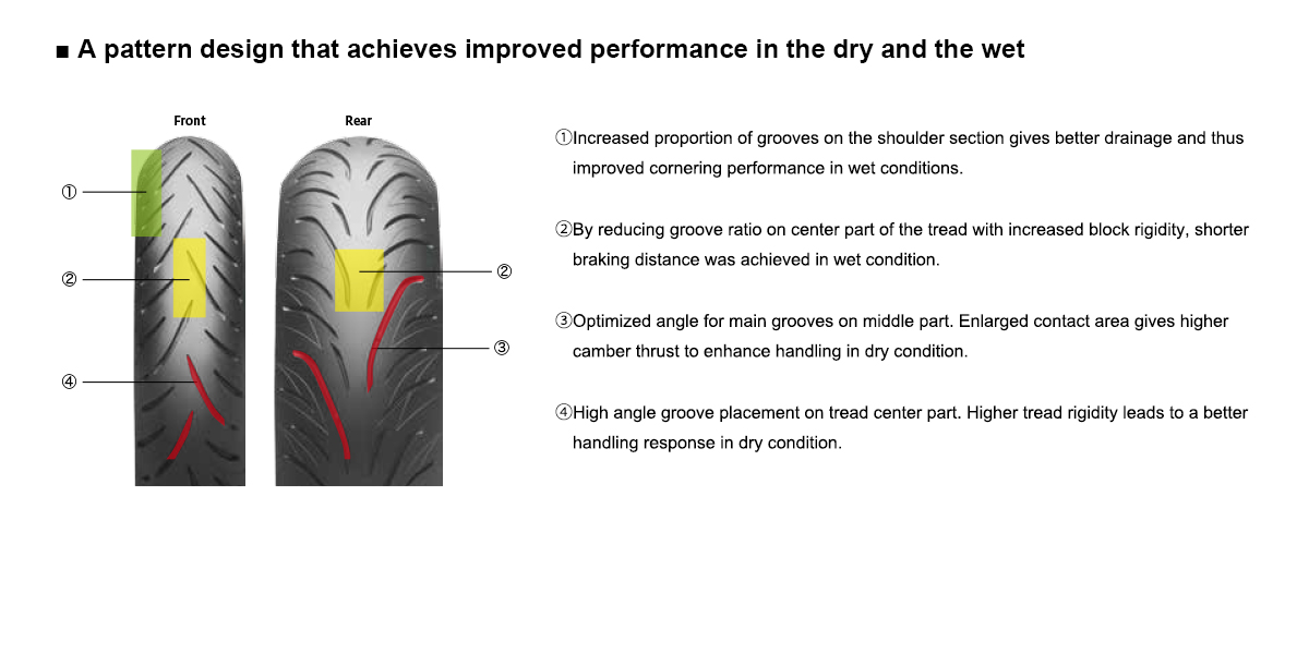 Provides confidence in riding even in adverse conditions such as rain or changing road surfaces. The wet performance of the SPORT TOURING T31 has been greatly improved. In particular, shorter braking distances on wet road surfaces and enhanced cornering grip give the rider increased confidence. Naturally, the tire also offers handling accuracy and high-speed stability on dry road surfaces. The ideal sports radial, capable of coping with the wide range of conditions that confront riders over a variety of road surfaces.